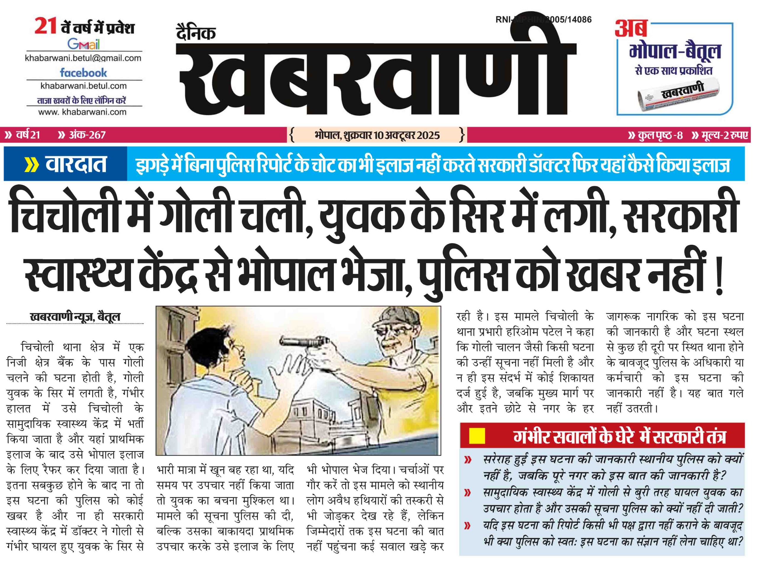चिचोली में गोली चली, युवक के सिर में लगी, सरकारी स्वास्थ्य केंद्र से भोपाल भेजा, पुलिस को खबर नहीं!