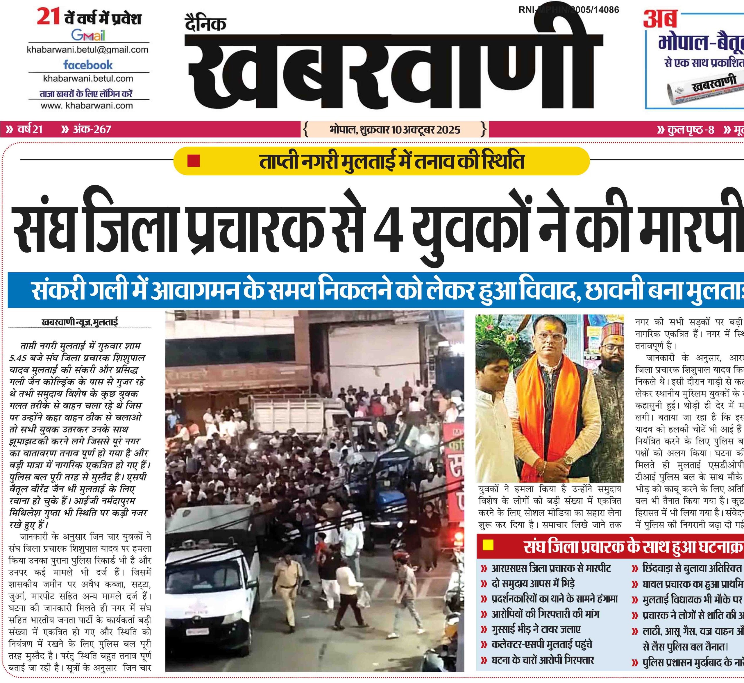 संघ जिला प्रचारक से 4 युवकों ने की मारपीट संकरी गली में आवागमन के समय निकलने को लेकर हुआ विवाद, छावनी बना मुलताई