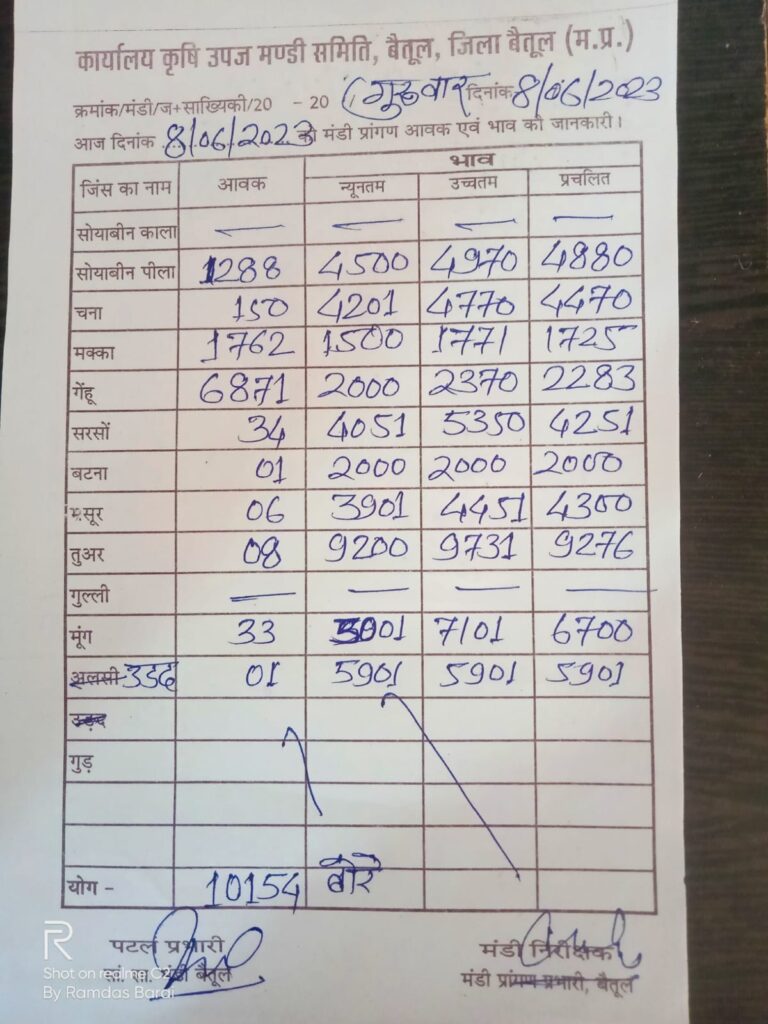 Betul Mandi Bhav – बैतूल कृषि उपज मंडी के आज (8 जून 23) दिन गुरुवार के भाव