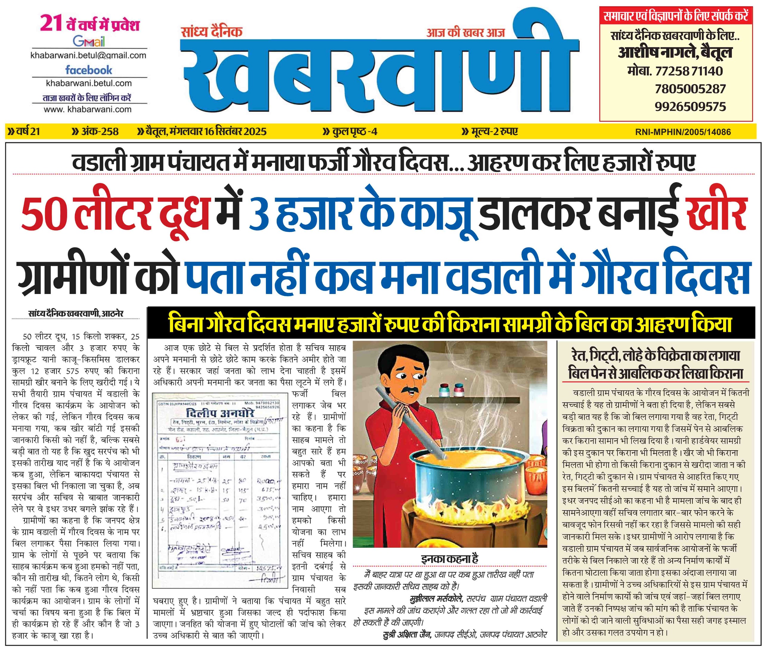 50 लीटर दूध में 3 हजार के काजू डालकर बनाई खीर ग्रामीणों को पता नहीं कब मना वडाली में गौरव दिवस वडाली ग्राम पंचायत में मनाया फर्जी गौरव दिवस… आहरण कर लिए हजारों रुपए