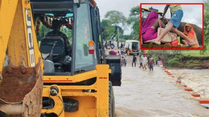 जेसीबी की बकेट से गर्भवती को कराया बहता नाला पार, दूसरी ओर खड़ी थी एम्बुलेंस