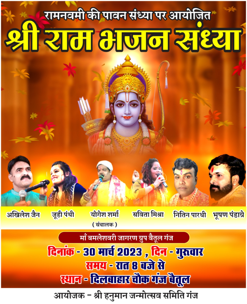 Shri Ram Bhajan Sandhyaबैतूल श्री हनुमान जन्मोत्सव समिति गंज के तत्वावधान में आज  रामनवमी के उपलक्ष्य में  दिलबहार चौक में श्री राम भजन संध्या का आयोजन किया गया है।