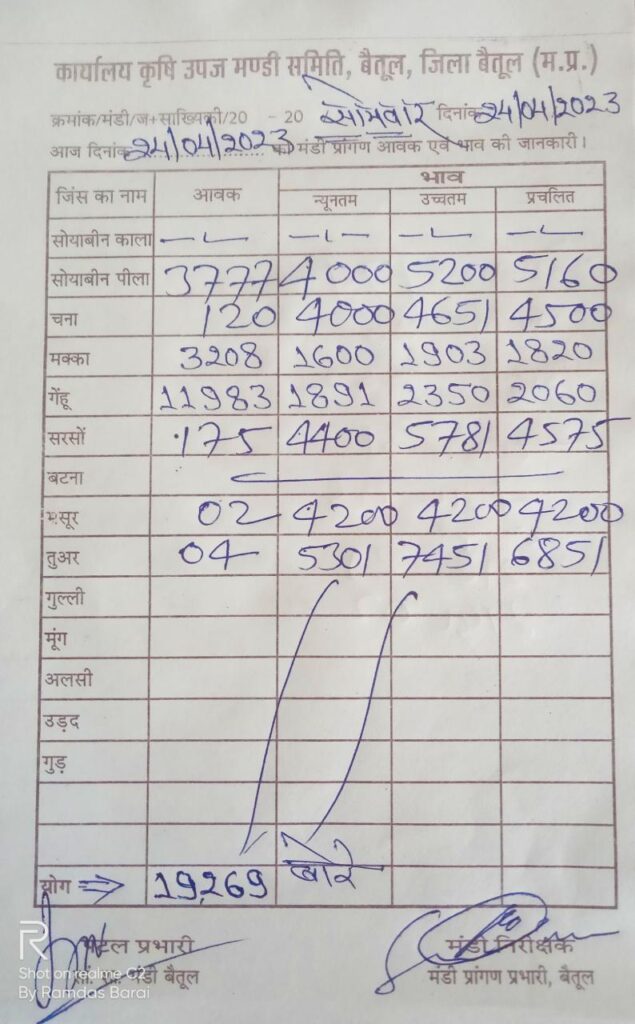 Today Mandi Bhav – बैतूल कृषि उपज मंडी के आज (24 अप्रैल 23) दिन सोमवार के भाव