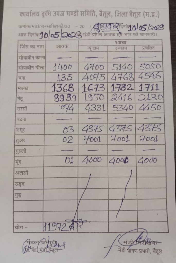 Today Mandi Bhav – बैतूल कृषि उपज मंडी के आज (10 मई 23) दिन बुधवार के भाव