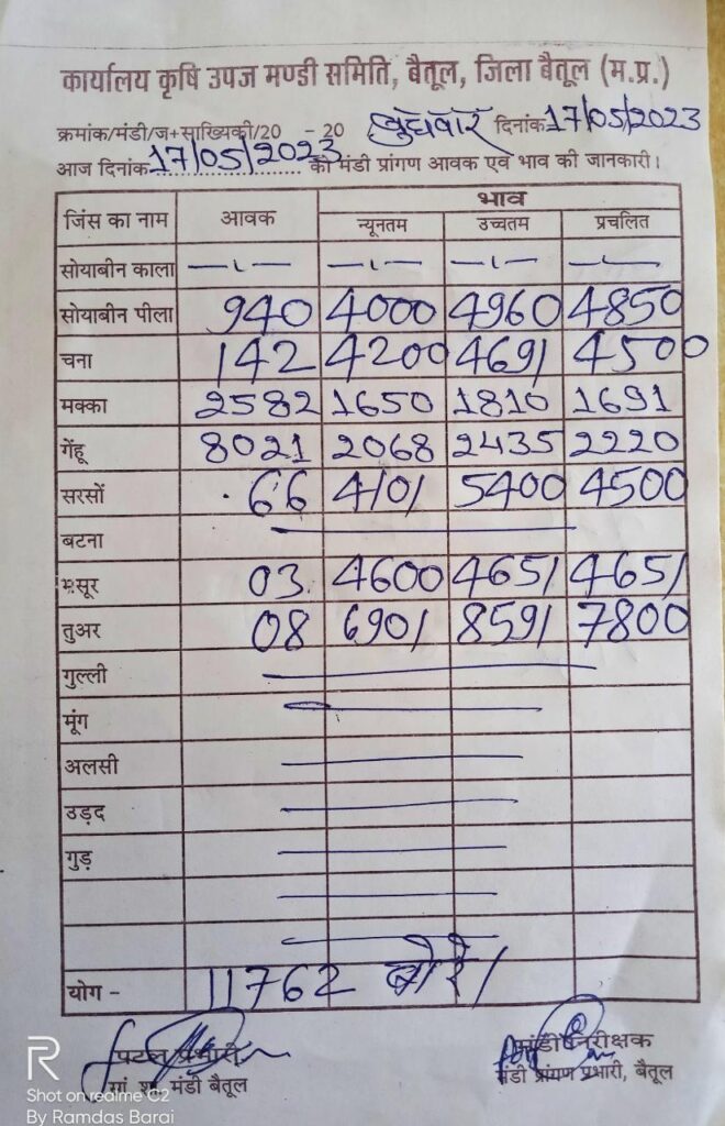 Today Mandi Bhav – बैतूल कृषि उपज मंडी के आज (17 मई 23) दिन बुधवार के भाव
