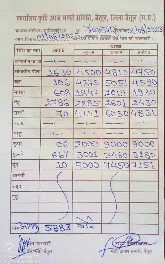 today mandi bhav – बैतूल कृषि उपज मंडी के आज (1 अगस्त 23) दिन मंगलवार के भाव