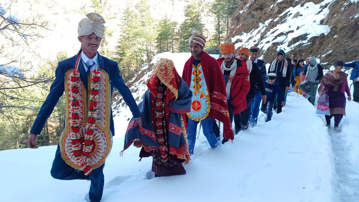 गीतेश ठाकुर बुनालीघर गांव के रहने वाले हैं और उनकी बारात को भैचाड़ी गांव जाना था। भारी बर्फबारी के बावजूद गीतेश अपनी बारात लेकर पैदल निकल पड़े। करीब सात किलोमीटर का सफर बर्फ में चलकर पूरा किया गया। बाराती हंसते गाते, एक दूसरे का सहारा बनते हुए आगे बढ़ते रहे। रास्ते में फिसलन और ठंड थी, लेकिन शादी का जोश सब पर भारी पड़ा।