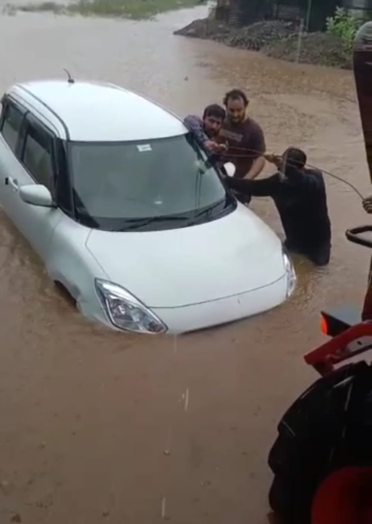 नगर में प्रभात पट्टन रोड पर दुर्गा मंदिर के पास नाले में पानी भरने के कारण एक कार गहरे पानी में डूब गई। ट्रेक्टर से खींचकर कार को पानी में से बाहर निकाला गया। यह तय अच्छा हुआ कि कोई गंभीर हादसा नहीं हुआ। क्योंकि कुछ देर के लिए कार पानी में तैरने लगी और कार में बैठे लोग घबरा गए थे।जिसे जैसे तैसे ट्रैक्टर से खींचकर पानी से बाहर निकाला गया।